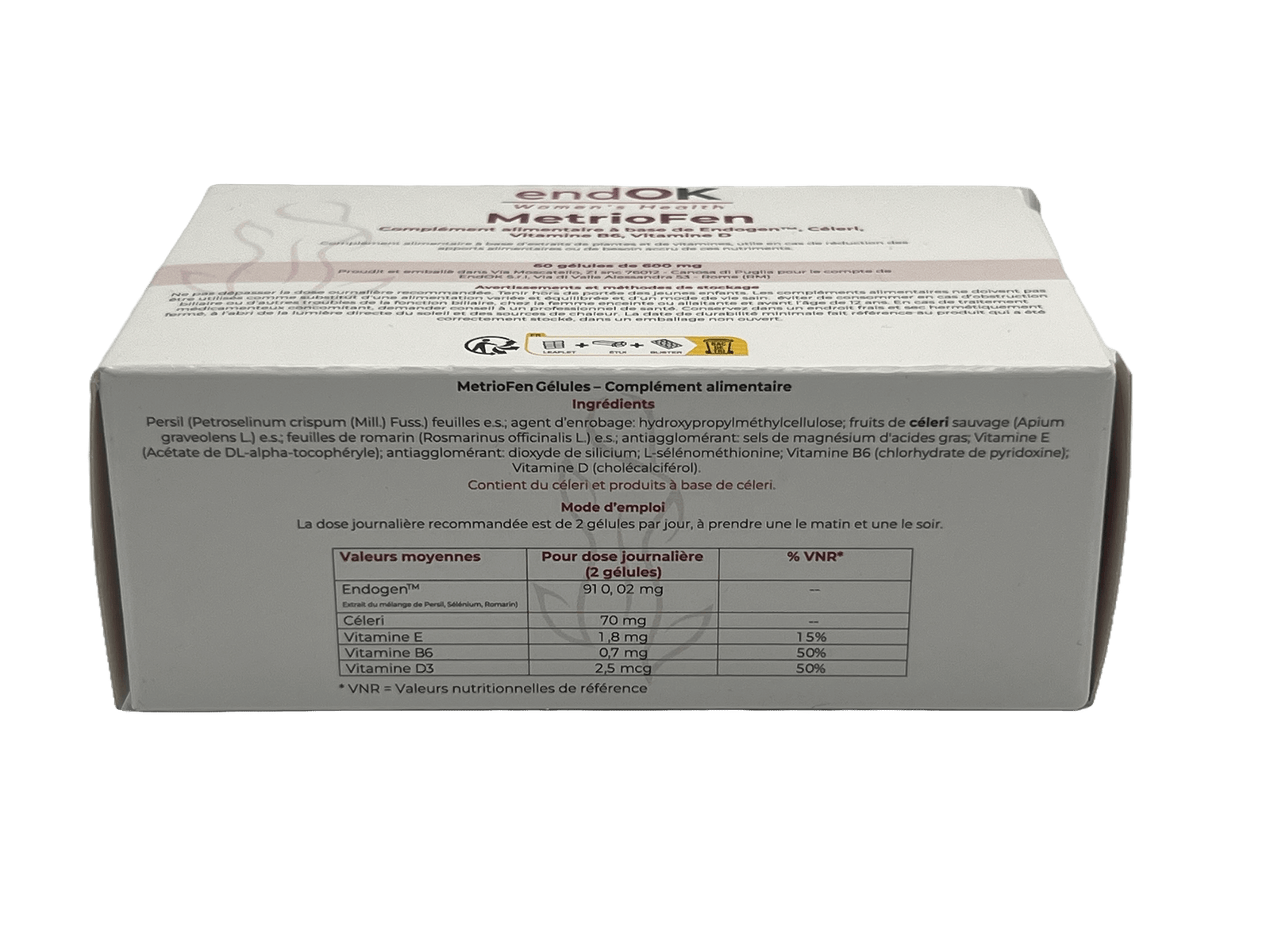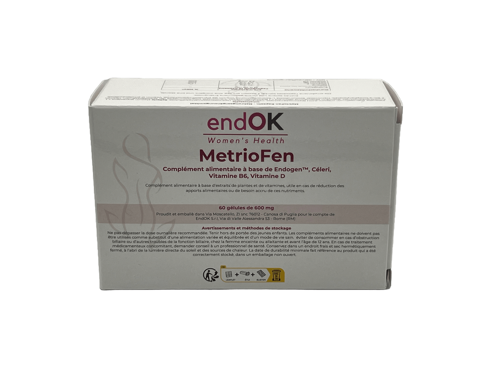 MetrioFen® est un produit ENDOK SRL, inspiré d’un brevet pour le traitement de l’endométriose, produit et conditionné en Italie. Il a été formulé pour les femmes en âge de procréer qui recherchent une solution spécifiquement formulée pour leur bien-être, également adaptée à une utilisation prolongée lorsque cela est indiqué.